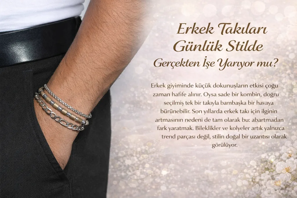 Erkek giyiminde küçük dokunuşların etkisi çoğu zaman hafife alınır. Oysa sade bir kombin, doğru seçilmiş tek bir takıyla bambaşka bir havaya bürünebilir. Son yıllarda erkek takı için ilginin artmasının nedeni de tam olarak bu: abartmadan fark yaratmak. Bileklikler ve kolyeler artık yalnızca trend parçası değil, stilin doğal bir uzantısı olarak görülüyor.